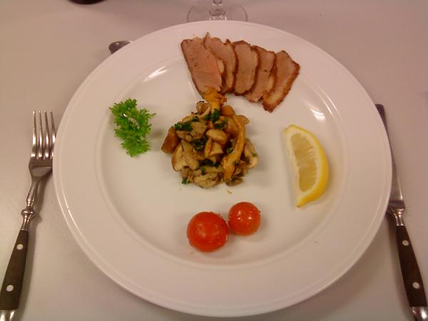 Imens steges svampene i smørret, tilsættes knust hvidløg og reven citronskal. Sluk for varmen og tilsæt lidt citronsaft og vend de hakkede krydderurter i. Fjern stilken fra cherrytomaterne, steg dem kort i varm olie og krydr med salt og peber.