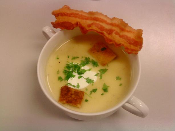 Leger suppen med fløden og monter til sidst med 100 g koldt smør i tern. Smag til med salt og stødt hvid peber.