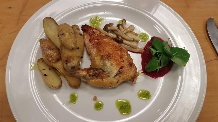 Perlehønebryst med Rødbedepuré og basilikum-olie
