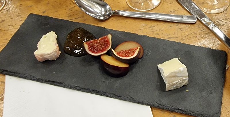 Anret 1 stykke Pont-l´Èvêque og 1 stykke Camembert, i hver side, på en skifer-plade.