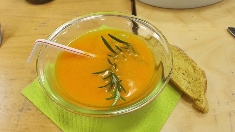 Rør forsigtigt rundt og pynt med frisk rosmarin og et sugerør.