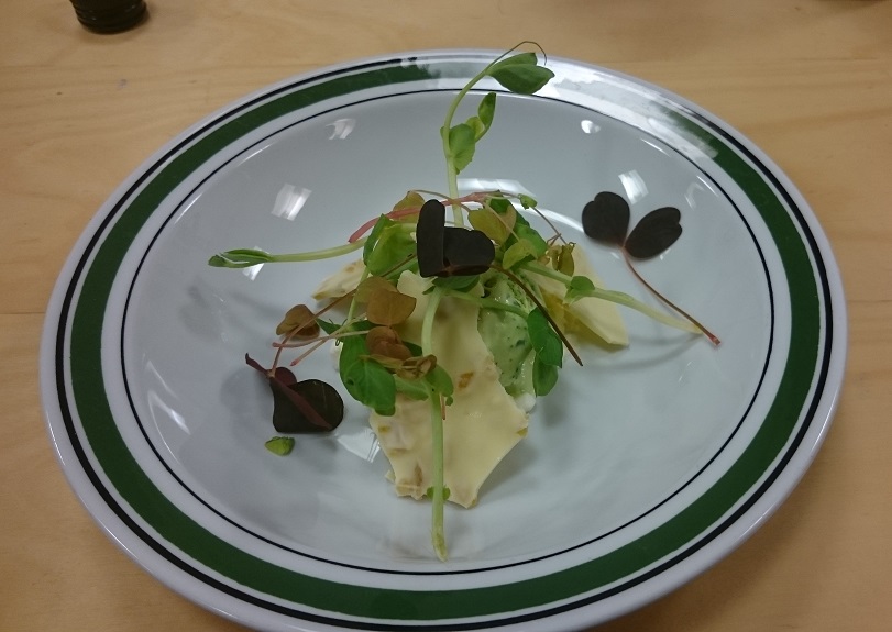 Start med et ”æg” citronskum i bunden af tallerknen. Kom en skefuld persille-is oveni.