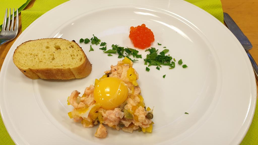 Skær laksekødet i meget små tern – evt på foodprocessor.
