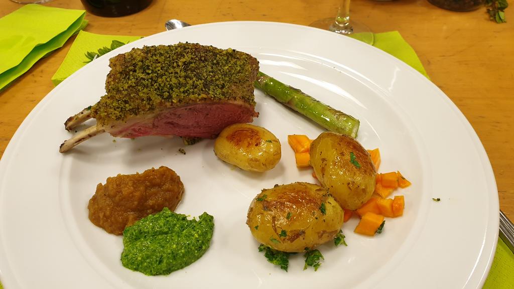 Krydret Lammekrone med Butternut, grillede Asparges, ramsløgspesto og nye Mallorca-kartofler